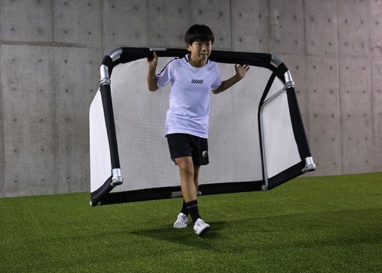 「倉庫や車からグラウンドへゴールを持ち運ぶ際の疲労」「トレーニング中のミニゴールの移動」「ゴール転倒による事故防止」など、あらゆる状況を想定し幅広い世代で安全に、ストレスなく使用できるよう軽量化に取り組みました。プロ選手のシュートにも動きにくく、スクール選手たちや女性の先生方でも持ち運び可能で、どなたでも気軽に導入できるミニゴールを実現しました。